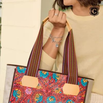 As two Texas-based craftsmanship brands, James Avery and Consuela are a natural fit for collaborating on this exclusive print tote bag. The Classic Tote, Consuela’s signature silhouette, is adorned with a print celebrating colors and symbols iconic to James Avery. Upon a coral-hued backdrop are vivid roses and heart shapes comprised of the distinctive James Avery flame. This colorful tote bag holds its shape while carrying all the essentials in the durable and easy-to-clean ConsuelaCloth™. The interior has a slide pocket and zipper pocket, keeping smaller items secure and easily accessible. Colorful woven striped double straps are trimmed in natural, untreated leather for a comfortable fit. HB-36-963882 Specifications